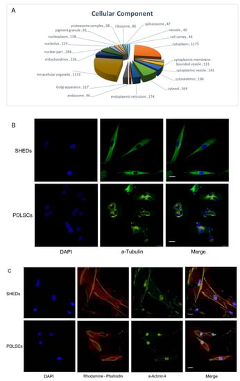 Cellular topology and distribution of the SHED-PDLSC “consensus” proteome generated via nano-LC-MS/MS employment and microscopic visualization of highly abundant cytoskeletal proteins. (A) Clustering of the identified, by nano-LC-MS/MS technology, proteins that were expressed in both SHEDs and PDLSCs (“consensus” proteome), into groups based on their cellular topology and distribution (“Cellular Component”). The Gene Ontology (GO) sub-routine of DAVID program was the bioinformatics protocol applied. p < 0.05. (B–D) Representative immunofluorescence images of SHEDs and PDLSCs, captured by confocal microscopy, demonstrating the expression of cytoskeletal proteins. (B) a-Tubulin revealed the characteristic spindle-like morphology and filamentous intracellular organization of microtubules cytoskeleton. (C) α actinin-4 is found along microfilament bundles and adherent junctions. (D) Vimentin is the major cytoskeletal component of mesenchymal cells. Blue: DAPI (nuclear staining). Green: antibodies for tubulin, actinin or vimentin. Red: phalloidin. Magnification: 63×.