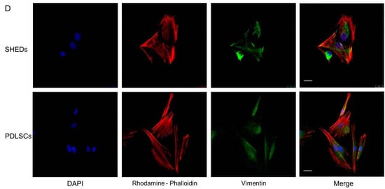 To visualize cells using confocal microscopy, the examined cells were seeded on cover slips and cultured under standard conditions for 24–48 h at passage 8. They were then fixed in 4% paraformaldehyde (Sigma/Aldrich, St. Louis, MO, USA) solution in 1× PBS working solution for 10 min at room temperature. Cell permeabilization was accomplished with 0.1% Triton-X 100 solution for 10 min, followed by 0.5% Triton-X 100 (Sigma/Aldrich, St. Louis, MO, USA) for 30 min. PDL and SHED primary cells were incubated in 5% BSA blocking solution for 1 h and then in a solution containing the antibody of interest in 0.5% Triton-X 100 and 1% BSA, overnight (~16 h) at 4 °C. Washing three times with 0.5% Triton-X 100 in 1× PBS was followed by cell incubation with the secondary antibody diluted in 0.5% Triton-X 100 in 1× PBS and 1% BSA for 2 h. Next, cells were washed in 0.5% Triton-X 100 before Rhodamine-Phalloidin 1:100 (Biotium, Lab supplies) was added. The cells were washed twice with 1× PBS and VECTASHIELD® Mounting Medium (Vector Laboratories, Inc., 30 Ingold Road, Burlingame, CA 94010 USA) was added on top to prevent rapid photo-bleaching of fluorescence. The primary antibodies used were anti-α Tubulin antibody (ab18251 rabbit 1:1000), anti-α Actinin 4 antibody (ab198608 rabbit 1:100) (Abcam, Cambridge, MA, USA), anti-Vimentin antibody (#3295 rabbit 1:100) (Cell Signaling Technology, Cambridge, MA, USA) and anti-Lamin A/C antibody (ab108595 1:1000) (Abcam). The secondary antibody used was Donkey anti-Rabbit IgG (H + L) Secondary Antibody Fluor® 488 conjugate (Invitrogen, Waltham, MA, USA). Detection of the nucleus was achieved using 4′-6′-Diamidino-2′-phenylindole (DAPI) staining. The samples were analyzed using a Leica TCS SP5 (Leica, Wetzlar, Germany) setup with a 63× objective lens and analyzed using the Leica software, LAS AF.
