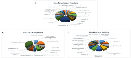 Bioinformatics dissection of the SHED-PDLSC “consensus” proteome generated via nano-LC-MS/MS employment. (A) Classification of the SHED-PDLSC “consensus”-proteome contents into several categories of “Specific Molecular Functions”. The Gene Ontology (GO) sub-routine of DAVID program was the bioinformatics tool engaged. p < 0.05. (B) Categorization of the SHED-PDLSC “consensus”-proteome components into groups carrying broad (general) cellular functions, through KEGG-pathway utilization (“Function Through KEGG”). (C) Assembly of the SHED-PDLSC “consensus”-proteome contents into clusters of specific cellular processes, by KEGG-pathway employment (“KEGG Pathway Analysis”).