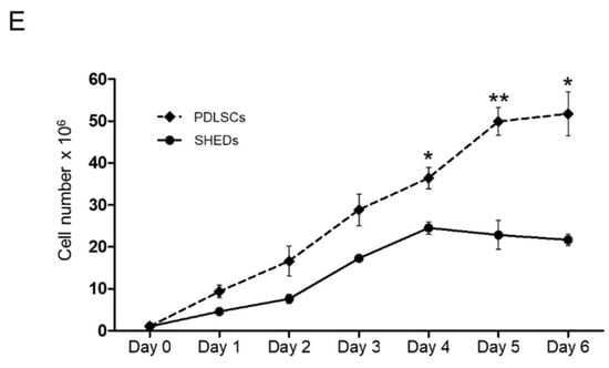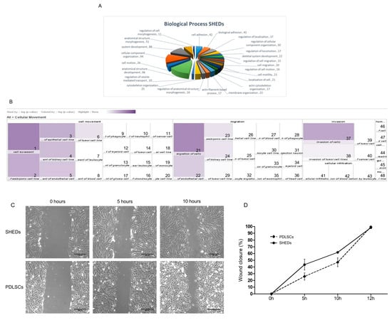Moreover, the proteins uniquely identified in SHEDs were suitably processed using the core analysis of Ingenuity Pathway Analysis (IPA) and a heat map was produced (Figure 3B). Interestingly, a concrete reassembly of 137 out of the 517 total SHED-specific proteins were linked to cellular movement, migration and invasion (2.46 × 10−3 < p < 6.15 × 10−9). This is in accordance with the result obtained from wound-healing assays performed for SHEDs and PDLSCs (Figure 3C), demonstrating the strong cellular capacity of SHEDs to migrate towards the artificial wound. SHEDs initially demonstrated a tendency for higher wound-healing activity than PDLSCs, but this difference was statistically insignificant (Figure 3D). In fact, 12 h after the artificial wound was generated, both cell populations revealed 100% wound-healing proficiency, indicating their excellent proliferation and migration capacity to heal a wound.