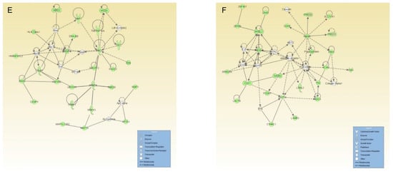 Additionally, 134 proteins were detected to be implicated in cellular assembly and organization (2.40 × 10−3 < p < 2.40 × 10−8), and 141 ones in cellular function and maintenance (2.41 × 10−3 < p < 2.40 × 10−8). The tight regulation that SHEDs linked to their cellular morphology, assembly and organization is highlighted by the network created via IPA employment, with its core components being identified as the binding partner of Hsp70, STIP1 homology and U-box containing protein 1 (STUB1), Ras-related C3 botulinum toxin substrate 1 (RAC1) and arginine methyltransferase 6 (PRMT6) (Figure 3E). Additionally, in regards to their cellular movement process, the network in Figure 3F illustrated the critical interactions between the core components and their binding partners that were all recognized among proteins exclusively detected in SHEDs (e.g., Gαq and Raf (Figure 3E); trypsin and WNT5A (Figure 3F)). These findings strongly indicate that SHEDs contain an increased number of protein molecules being implicated in the control of cellular plasticity and adaptation to extrinsic and environmental stimuli.
