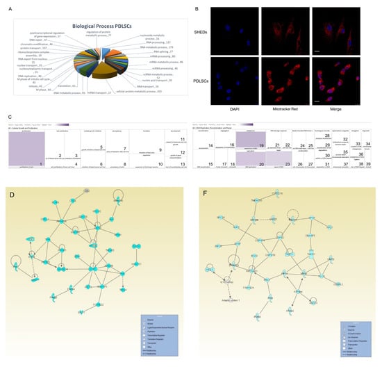 The PDLSC-specific-proteome contents catalogued via engagement of the nano-LC-MS/MS technology. (A) Categorization of the identified, via nano-LC-MS/MS advanced protocols, PDLSC-specific proteome into several protein classes, choosing as bioinformatics filter their contribution to general “Biological Processes”. The Gene Ontology (GO) sub-routine of DAVID program was the bioinformatics tool employed. p < 0.001. (B) Mitochondria visualisation by MitoTracker® Red CMXRos dye. Blue: DAPI (nuclear staining). Magnification: 63×. (C) Two heat maps of the PDLSC-specific proteomic catalogue, illustrating 545 proteins involved in cellular growth and proliferation (left panel) and 207 ones engaged in DNA replication, recombination and repair (right panel). These two PDLSC-specific heat maps were generated by employing IPA. Legends indicate respective functions and p values: 1, Proliferation of cells (9.539); 2, Cell proliferation of breast cancer cell lines (3.612); 3, Cell proliferation of fibroblasts (3.121); 4, Cell proliferation of tumor cell lines (2.596); 5, Contact growth inhibition of breast cell lines (3.608); 6, Contact growth inhibition of breast cancer cell lines (2.972); 7, Pluripotency of embryonic stem cell lines (3.710); 8, Pluripotency of cells (2.481); 9, Formation of foam cells (4.664); 10, Expansion of cholinergic neurons (2.739); 11, Development of melanoma cell lines (2.739); 12, Growth of yeast (2.664); 13, Colony formation of neuroblastoma cell lines (2.367); 14, Recombination (7.149); 15, DNA recombination (6.826); 16, Segregation of chromosomes (6.827); 17, Segregation of sister chromatids (4.307); 18, Segregation of mitotic sister chromatids (2.722); 19, Metabolism of DNA (9.711); 20, DNA replication (8.840); 21, DNA damage response of cells (5.032); 22, DNA damage response of cervical cancer cell lines (3.543); 23, Repair of DNA (8.406); 24, Double stranded DNA break repair (4.612); 25, Double stranded DNA break repair of cervical cancer cell lines (2.831); 26, Condensation of mitotic chromosomes (3.608); 27, Condensation of chromosomes (3.338); 28, Homologous recombination (2.951); 29, Homologous recombination of cells (2.810); 30, Degradation of DNA fragment (3.044); 31, Degradation of DNA (2.632); 32, Dyskeratosis congenita (4.118); 33, Elongation of DNA (3.475); 34, Alignment of chromosomes (2.972); 35, Excision repair (3.782); 36, Mutagenesis of cells (2.869); 37, Chromosomal aberration (3.643); 38, Ligation of DNA fragment (2.739); 39, Remodeling of chromatin (2.725). (D) IPA-mediated assembly of interaction networks for proteins exclusively synthesized in PDLSCs, and critically involved in DNA replication, cell cycle, division, proliferation, DNA recombination and repair. (E) Growth curves of SHEDs and PDLSCs. Cells at passage 6 were stained with 0.4% trypan blue solution and standard hematocytometry (Neubauer) was applied to determine cell number and viability. Measurements are from three independent experiments. *: p < 0.05. **: p < 0.01. (F) Ingenuity network was created for PDLSCs regarding cell cycle and cellular assembly and organization. Protein molecules identified by our analysis are shown in blue color, whereas the ones missing from our proteomic catalogue (but still belonging to the IPA molecular networks) remain uncolored.