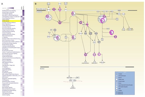Comparative quantification of molecular pathway’s competence in SHED- and PDLSC-specific proteomes—IPA-mediated reconstruction of Rho-GDI signaling network. (A) A unified heat map created via IPA utilization, illustrating selected canonical molecular pathways likely operating, (albeit differently), in both SHED and PDLSC sub-populations. The intensity of purple color is proportional to the -log (p value), while the decreased-color intensity denotes the fewer number of genes recognized for each of the indicated functions. (B) The Rho-GDI signaling pathway, as generated by IPA application. Annotated proteins from the SHED-specific proteomic list are indicated in purple circle-perimeter, while the ones from PDLSC-specific proteomic catalogue are shown in grey circle-filling.