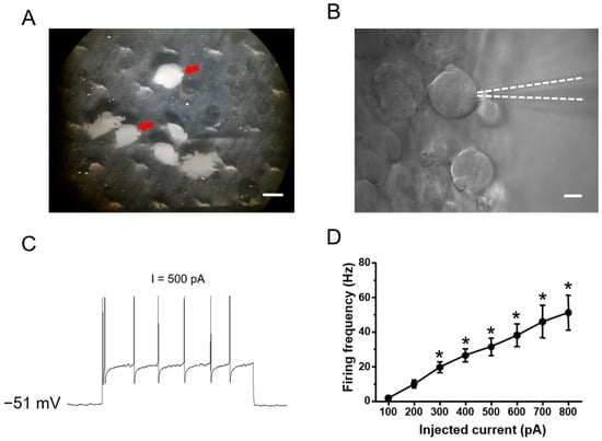 DRG neurons were visualized with a 40× water-immersion objective using a microscope (BX51WI; Olympus, Tokyo, Japan) equipped with infrared differential interference contrast optics. Whole-cell current and voltage recordings were acquired with an Axon700B amplifier (Molecular Devices Corporation, Sunnyvale, CA, USA). Patch pipettes (4–7 MΩ) were pulled from borosilicate glass capillaries on P-97 puller (Sutter Instruments, San Rafael, CA, USA). The series resistance was 10–20 MΩ. Neurons were selected for further study if they had a resting membrane potential negative than −50 mV and if they exhibited overshooting action potentials.