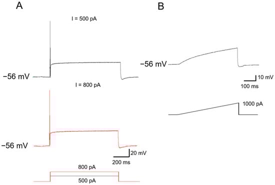 Typical examples of Class 3 neurons. (A) Typical recording traces showing that only one spike can be induced by depolarizing current steps (n = 17); (B) In this class of neurons, no action potential was induced by current ramp injections. Note (A,B) were recorded from the same neuron.