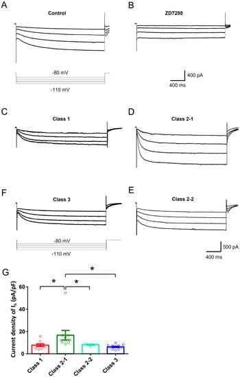 Much evidence has accumulated showing that hyperpolarization-activated cation current (Ih) is important in influencing the excitability and driving repetitive firing in primary nociceptive neurons and pain pathophysiology [27,28,29]. An important role of persistent sodium current (INa,P) and potassium current has been revealed in the determination of excitability type reported in mesencephalic V neurons [13]. In the present study, we are interested to know whether Ih is important in determining different types of excitability in large DRG neurons. Consistent with previous reports [30,31,32], Ih recorded in our study displays as an inward current in response to hyperpolarizing potentials of −60 to −120 mV from a holding potential of −60 mV (Figure 4A–D for typical examples). This inward current is highly sensitive to ZD7288 (15 µM), a selective blocker of Ih [32] (Figure 4A,B). Although inward rectifier K+ current could also be evoked by these hyperpolarizing voltage steps, this current is unlikely to contribute to the recorded current because of its fast, instantaneous activation kinetics and very low expression in DRG neurons [33].