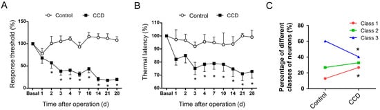 (A,B) Development of mechanical hypersensitivity and thermal hyperalgesia following chronic compression of DRG (CCD) in rats; (A) Mechanical hypersensitivity developed in the ipsilateral hind paws from CCD rats but not in sham controls. Note that paw withdrawal mechanical threshold (PWMT) to von Frey hairs decreased dramatically from the second day following chronic compression of L4/L5 DRG (n = 10; Two way ANOVA, F(1,150) = 218.5, p < 0.0001; in multiple comparisons, * p < 0.05 vs. Control); (B) Thermal hyperalgesia was observed by measuring paw withdrawal thermal latency (PWTL) to radiant heat in CCD rats and sham controls for ipsilateral hind paws. Note that PWTL significantly decreased in CCD rats (n = 10; Two way ANOVA, F(1,140) = 41.67, p < 0.0001; in multiple comparisons, * p < 0.05 vs. Control), but not in sham group with a similar time course with mechanical hypersensitivity; (C) Upon chronic compression of lumbar DRGs, the percentage of neurons showing different classes of excitability underwent plastic changes. The proportion of Class 1 and Class 3 neurons reciprocally displayed marked increase and decrease (Class 1: Pearson χ2 test, F = 9.842, * p = 0.002; Class 3: Pearson χ2 test, F = 12.321, * p < 0.001). Class 2 neurons did not show obvious alteration (n = 22–48, Pearson χ2 test, F = 1.338, p = 0.247). All data are expressed as mean ± S.E.M.