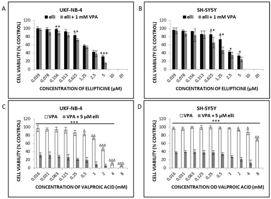 Cytotoxicity (viable cells % control) of ellipticine (elli) and/or valproic acid (VPA) or their combination in UKF-NB-4 (A,C) and SH-SY5Y (B,D) cells after 48 h exposure to drugs, measured by the MTT assay. Values are mean ± SD from three independent experiments. Panels (A–D) and D—*** p < 0.001, ** p < 0.01, * p < 0.5, significant differences between treatment with ellipticine or VPA alone and their combination (ANOVA with post-hoc Tukey HSD Test). Panels (C,D)—∆∆∆ p < 0.001, ∆∆ p < 0.01, ∆ p < 0.5, significant differences between VPA treatment compared to control (ANOVA with post-hoc Tukey HSD Test).