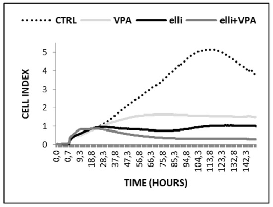 The xCELLigence RTCA DP Instrument (ACEA Bioscience Inc., San Diego, CA, USA) placed in a humidified incubator at 37 °C and 5% CO2 was utilized for real-time label free monitoring of cell viability [62]. UKF-NB-4 and/or SH-SY5Y cell lines (15,000 cells) were seeded into wells of 16-well plates for impedance-based detection. Every treatment situation (control, 1 mM VPA, 5 µM ellipticine and the mixture of 1 mM VPA with 5 µM ellipticine) was analyzed in duplicate. Cell index (CI) was measured every 30 min for 140 h and results were monitored using the supplied RTCA software.