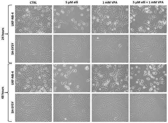 The cytotoxic potency of 5 µM ellipticine in the presence of 1 mM VPA was also increased in UKF-NB-4 cells when cell growth was analyzed using the xCELLigence system (Figure 2). The results shown in Figure 2 indicated that the UKF-NB-4 cell line cultivated with VPA grow slowly up to ~56 h of culture; their cell index did not increase after this time of cultivation. UKF-NB-4 cells exposed to ellipticine grow exponentially up to 28 h in culture, but after this time period their growth slowed down before it increased again after 75 h in culture. The highest cytotoxicity in UKF-NB-4 cells was observed by co-treatment of ellipticine with VPA; the value of cell index was lowered almost to zero (Figure 2). The xCELLigence system could not be utilized to study the effects of VPA and ellipticine in SH-SY5Y cells, because VPA led to alterations in cell morphology (Figure 3). Alterations in a cell status, i.e., cell morphology, lead to changes in values of cell index.