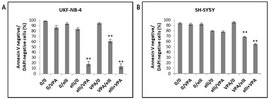 Viability of UKF-NB-4 (A) and SH-SY5Y (B) cells after incubation with 5 μM ellipticine (elli) or 1 mM valproic acid (VPA) and their various combinations. Experimental treatment conditions are described in Table 1. Values are mean ± SD from three independent experiments. ** p < 0.01 as compared to elli/0 group (ANOVA with post-hoc Tukey HSD Test).