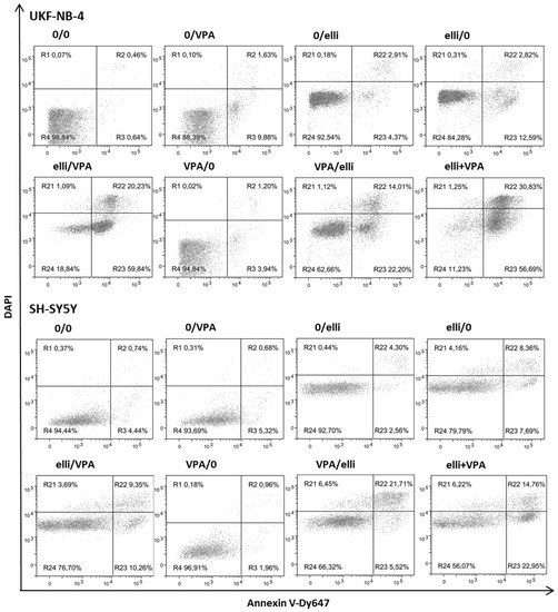 Induction of apoptosis in UKF-NB-4 and SH-SY5Y cells exposed to 1 mM valproic acid (VPA), 5 µM ellipticine (elli) and their combinations. Experimental treatment conditions are described in Table 1. Control cells (0/0) are incubated in medium without drugs. Apoptosis was measured using Annexin V-Dy647/DAPI labeling. Representative data from one of three independent experiments are shown.