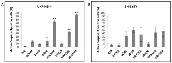 The percentage of UKF-NB-4 (A) and SH-SY5Y (B) cells with active caspase-3 after treatment with 1 mM valproic acid (VPA), 5 µM ellipticine (elli) and their combinations for 48 h. Experimental treatment conditions are shown in Table 1. Values represent mean ± SD from three independent experiments. ** p < 0.01 as compared to elli/0 group (ANOVA with post-hoc Tukey HSD Test).