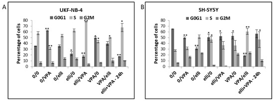 Cell cycle analysis in UKF-NB-4 (A) and SH-SY5Y (B) cells after exposure to 5 µM ellipticine (elli) and 1 mM valproic acid (VPA) and their various combinations. Experimental treatment conditions are shown in Table 1. Values represent mean ± SD from three independent experiments. ** p < 0.01, * p < 0.05 as compared to 0/0 group (ANOVA with post-hoc Tukey HSD Test).