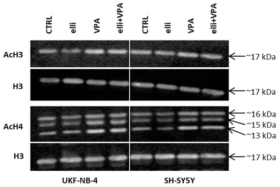 In the next phase of our study, we studied the changes in acetylation of histones H3 and H4 in UKF-NB-4 and SH-SY5Y cell lines exposed to VPA, ellipticine and both drugs in a combination.