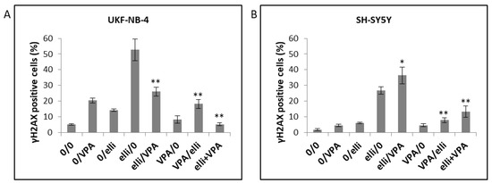 Analysis of phosphorylated H2AX in UKF-NB-4 (A) and SH-SY5Y (B) cells induced by 5 µM ellipticine (elli), 1 mM valproic acid (VPA) and their various combinations. Experimental treatment conditions are described in Table 1. Values represent mean ± SD from three independent experiments. * p < 0.05, ** p < 0.01 as compared to elli/0 group (ANOVA with post-hoc Tukey HSD Test).