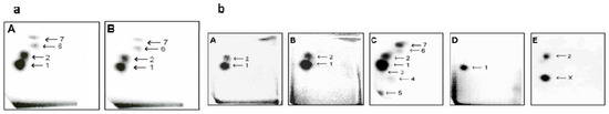 Autoradiographic profile of 32P-labeled ellipticine-derived DNA adducts generated in UKF-NB-4 (aA) and SH-SY5Y (aB) cells. DNA adduct pattern generated in calf thymus DNA by ellipticine after its activation with CYP3A4 in the presence of NADPH without (bA) and with cytochrome b5 (CYP3A4: cytochrome b5 of 1:5) (bB) (42); DNA of male rat liver treated with 40 mg/kg body weight ellipticine (bC) (31); from calf thymus DNA reacted with 13-hydroxyellipticine (bD) (39) or 12-hydroxyelipticine (bE) (40). Analyses were carried out using the nuclease P1 enrichment version of the 32P-postlabeling method. Adduct spots 1–7 correspond to the ellipticine-derived DNA adducts and were assigned as previously described [31].