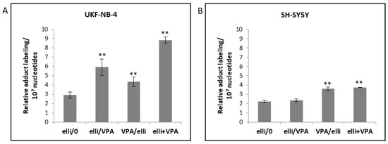 Total levels of ellipticine-derived DNA adducts formed in UKF-NB-4 (A) and SH-SY5Y (B) cells after treatment with 5 µM ellipticine (elli) and with this drug combined with 1 mM valproic acid (VPA) determined by 32P-postlabeling. Experimental treatment conditions are described in Table 1. Relative adduct labeling is expressed as adducts per 107 normal nucleotides. Values represent mean ± SD from three independent experiments. ** p < 0.01 as compared to elli/0 group (ANOVA with post-hoc Tukey HSD Test).