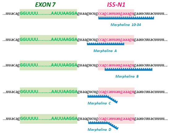 Morpholino (MO) sequences design. We designed four new MO sequences (A, B, C and D) against the negative intronic splicing silencer (ISS-N1) of survival motor neuron 2 (SMN2), downstream of exon 7, that differed in the binding site compared to the already validated MO-10-34. The MO A and MO B sequences have perfectly complementary sequences to their target site, while only the first 10 nucleotides of MO C and MO D perfectly match with the target sequence within ISS-N1.