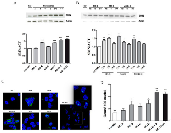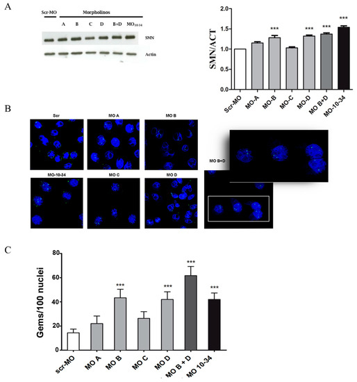 The data obtained by western blot analysis were confirmed by immunocytochemistry analysis to detect the formation of nuclear complexes formed by SMN aggregates and other proteins, called nuclear gems, which are essential for pre-mRNAs splicing (Figure 2B). All the tested sequences increased the number of nuclear gems (Figure 2C). Interestingly, cells treated with MO B + MO D showed a greater increase in the formation of gems, even compared to what was observed in cells treated with MO-10-34 (p < 0.001, Figure 2C).