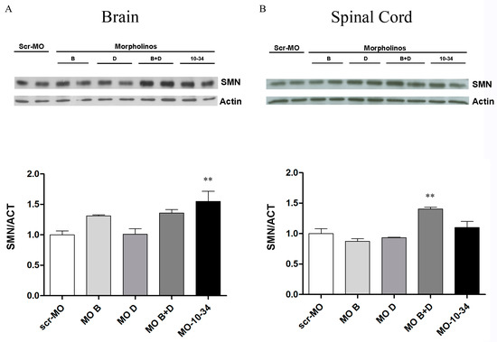 To confirm the results obtained in vitro, we tested the most efficacious MO sequences in the SMA∆7 murine model. Heterozygous pups were treated with MO B, MO D, MO B + MO D, MO-10-34 or scr-MO by intracerebroventricular (ICV) injections at P1 and subcutaneous (SC) injections at P1 and P3 (12 nmoles total dose for each group), which is similar to the protocol used in our previous study [11]; brains (Figure 4A) and spinal cords (Figure 4B) were harvested at P7 and analyzed by western blot. In the brain, higher levels of SMN were detected by western blot analysis for all MO samples compared with scr-MO samples. Intriguingly, co-administration of MO B + MO D was the most effective treatment, even more than MO-10-34, in the spinal cord of treated mice (p < 0.01, Figure 4B).