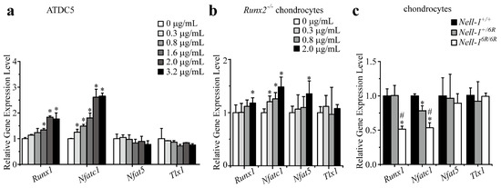 - Chen, W.; Zhang, X.; Siu, R.K.; Chen, F.; Shen, J.; Zara, J.N.; Culiat, C.T.; Tetradis, S.; Ting, K.; Soo, C. Nfatc2 is a primary response gene of Nell-1 regulating chondrogenesis in ATDC5 cells. J. Bone Miner. Res. 2011, 26, 1230–1241. [Google Scholar] [CrossRef] [PubMed]