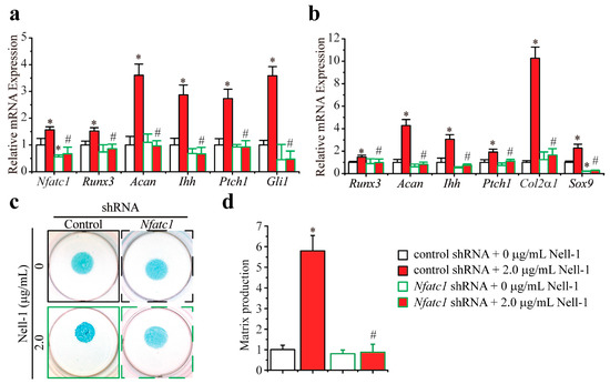 Nfatc1 is the bridging molecule between Nell-1 and the Runx3-Ihh signaling pathway in Runx2−/− rib chondrocytes. (a) Transcription of Runx3 and Ihh signal-related molecules in monolayer cultured Runx2−/− rib chondrocytes after 12-h stimulation of Nell-1; (b) Transcription of Runx3 and Ihh signal-related molecules in 3D micromass cultured Runx2−/− chondrocytes after 3-day stimulation of Nell-1; (c) Alcian Blue staining of 3D micromass cultured Runx2−/− chondrocytes after 3-day stimulation of Nell-1; (d) Alcian Blue incorporation into the extracellular matrix of micromass cultures reflecting the production of the proteoglycan-rich cartilaginous matrix at day 3 was quantified after extraction. The dye concentration of each group was normalized to that of the control shRNA + 0 µg/mL Nell-1 group. Mean + SD of three independent experiments performed in triplicate are shown. *: p < 0.05 vs. control shRNA + 0 µg/mL Nell-1, #: p < 0.05 vs. control shRNA + 2.0 µg/mL Nell-1.
