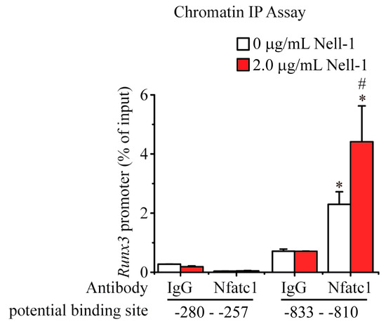Nell-1 enhances the binding of Nfatc1 and Runx3-promoter in Runx2−/− rib chondrocytes. Chromatin Immunoprecipitation (ChIP) assay of Nfatc1’s binding affinity to two potential binding sites on the Runx3 promoter was performed in Runx2−/− rib chondrocytes. *: p < 0.05 vs. IgG + 0 µg/mL Nell-1, #: p < 0.05 vs. Nfatc1 antibody + 0 µg/mL Nell-1. Mean + SD of three independent experiments performed in triplicate are shown.