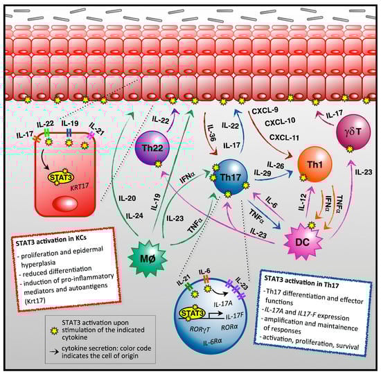 The scheme depicts the main cell types involved in psoriasis pathogenesis, the cytokines/chemokines produced and their target cells. The arrows indicate cytokines that are produced by the different cell types, and the cells where these mainly exert their effector functions. The yellow stars represent events of cytokine-induced STAT3 activation. In the blow-ups, indicated by the dotted lines, the two main cell types involved, Th17 CD4+ T lymphocytes, and keratinocytes, along with details of STAT3-mediated functions and a description of their main pathogenetic features are represented. See text for details and references.