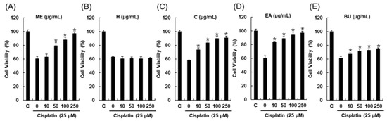 Protective effects of the MeOH extract (ME) of Streptomyces sp. RB1 and its fractions (hexane-soluble (H), CH2Cl2-soluble (C), EtOAc-soluble (EA), and n-BuOH-soluble fractions (BU)) in LLC-PK1 cells exposed to 25 μM of cisplatin for 24 h by MTT assay. Protective effects of (A) ME, and (B) H fraction, (C) C fraction, (D) EA fraction, and (E) BU fraction in LLC-PK1 cells exposed to 25 μM of cisplatin for 24 h by MTT assay. The concentrations of samples were 0, 10, 50, 100 and 250 μg/mL. Control cells were treated with the vehicle only (mean ± SD, * p < 0.05 compared to the control).