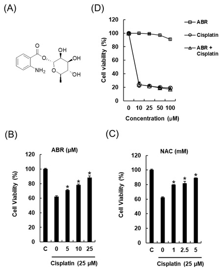 Protective effect of 1-O-(2-aminobenzoyl)-α-l-rhamnopyranoside (ABR) in LLC-PK1 cells exposed to 25 μM of cisplatin for 24 h by MTT assay. (A) Chemical structure of ABR. Dose-dependent protective effects of (B) ABR and (C) N-acetyl cysteine (NAC) in LLC-PK1 cells exposed to 25 μM of cisplatin for 24 h by MTT assay; (D) Combined effects of ABR and cisplatin on the cell viability in human ovarian cancer A2780 cells. NAC was used as a positive control. Control cells were treated with the vehicle only (mean ± SD, * p < 0.05 compared to the control).