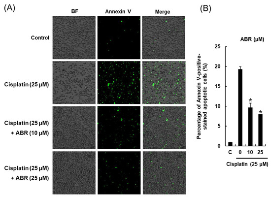 We further explored whether ABR could decrease apoptosis in LLC-PK1 cells exposed to cisplatin through annexin V Alexa Fluor 488 staining. As shown in Figure 3, apoptotic cells were stained green with annexin V Alexa Fluor 488. Bright-field (BF) and merge images are also shown in Figure 3A. The percentage of Annexin V-positive-stained apoptotic cells is shown in the bar graph. The percentage of apoptotic cells was increased by 25 μM cisplatin from 1.00% ± 0.00% to 19.33% ± 0.57%, whereas it was decreased by 9.66% ± 1.15% and 8.00% ± 0.00% when cells were pretreated with 10 or 25 μM ABR, respectively (Figure 3B).