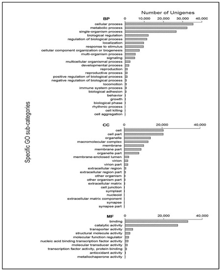 Gene function classification of all unigenes annotated by GO. “BP” represents “Biological Process” domain, “CC” represents “Cellular Component” domain and “MF” represents “Molecular Function” domain.