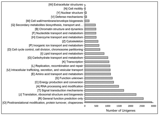 According to the annotations in the KOG database, 21,569 annotated unigenes were subdivided to 25 groups. The top KOG category was “Posttranslational modification, protein turnover, chaperones” (2931, 13.58%), followed by “General function prediction only” (2557, 11.85%). The smallest groups were “Cell motility” (21, 0.09%) and “Extracellular structures” (21, 0.09%) (Figure 3).