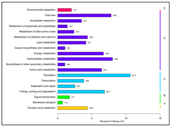 KEGG Classification. KEGG means Kyoto Encyclopedia of Genes and Genomes. The Y axis gives specific pathways in the second hierarchy. “A, B, C, D and E” (yellow, green, blue, purple and pink) represent five groups of pathways in the first hierarchy: Cellular Processes, Environmental Information Processing, Genetic Information Processing and Organismal Systems.