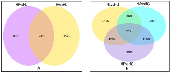 Venn Diagram of DEGs (differentially expressed genes). (A) was the comparison of DEGs in HAvsHL and HFvsHL; (B) was the comparison of DEGs in HLvsHG, HAvsHG and HFvsHG.