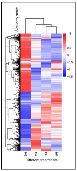 To investigate the effect of a different inducing factor of H. pluvialis, six comparison groups of DEGs were set as follows: HLvsHG—high light treatment group (HL) compared with green growth group (HG); HAvsHG—addition of acetate together with high light treatment (HA) compared with green growth group; HAvsHL—addition of acetate together with high light treatment compared to only high light treatment; HFvsHG—addition of Fe2+ together with high light treatment (HF) compared with green growth group; HFvsHL—addition of Fe2+ together with high light treatment compared to only high light treatment; HAvsHF—acetate treatment compared with Fe2+ treatment. The DEG numbers for each comparison group are shown in Table 3. When using HG as control, there were more DEGs in HAvsHG, HFvsHG and HLvsHG groups than using HL as control, like HAvsHL and HFvsHL groups. The Venn Diagram of DEGs (Figure 5) showed that there were 9731 similar DEGs compared to HG group and 245 similar DEGs compared to HL group. Cluster analysis of DEGs was used for judging the expression pattern of DEGs under different experimental conditions (Figure 6). The cluster of DEGs showed that HL, HF and HA had significantly different expression patterns than HG and HF was more similar to HL, which means that stress, high light, acetate and Fe2+, caused a pronounced change in gene expression and that the effect of acetate was greater than that of Fe2+.