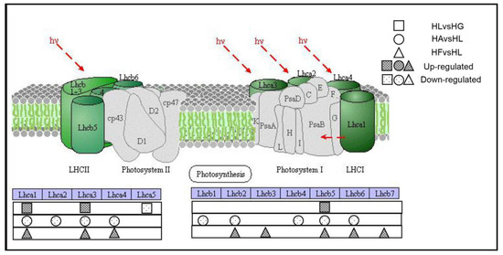 The antenna proteins that exist in light-harvesting chlorophyll protein complexes in green plants act as peripheral antenna systems, enabling more efficient absorption of light energy. The DEGs related to the photosynthetic—antenna protein pathway (pathway map: ko00196) is shown in Table 6. The genes encoding light-harvesting complex I chlorophyll a/b binding proteins 1–5 (LHCA1–5) encode binding proteins in light-harvesting complex I and those encoding light-harvesting complex II chlorophyll a/b binding proteins 1–7 (LHCB1–7) encode binding proteins in light-harvesting complex II. In HLvsHG, the significantly up-regulated genes were LHCA1, LHCA3 and LHCB5. More up-regulated genes were found in HFvsHL, including LHCA1, LHCA3, LHCA4, LHCB2, LHCB3, LHCB5, LHCB6 and LHCB7. But in HAvsHL, all of the genes related to photosynthesis-antenna proteins were down-regulated (Figure 9). These results indicate that under high light condition, the genes related to photosynthesis-antenna proteins are partially up-regulated. Adding Fe2+ to cultures under high light condition up-regulated the expression of additional photosynthesis-antenna genes, whereas acetate down-regulated the expression of photosynthesis-antenna genes.