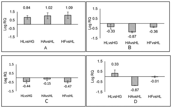 The results of qRT-PCR. “RQ” represented 2−ΔΔCt and “Log (RQ) > 0” means the gene was up-regulated, “Log (RQ) < 0” means the gene was down-regulated. (A–D) represented crtZ, crtISO, lcyB and ZEP, respectively.