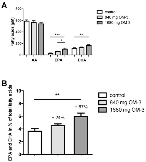 Omega-3 polyunsaturated fatty acids (n-3 PUFAs, shown as OM-3 in all figures) change the fatty acid composition in the blood cell fraction and affect the percentage of docosahexaenoic acid (DHA) and eicosapentaenoic acid (EPA) of total fatty acids in hyperlipidemic subjects. (A) Arachidonic acid (AA), EPA, and DHA levels in the control group and patients with 840 and 1680 mg n-3 PUFA supplementation; (B) Effect of n-3 PUFA supplementation on the percentage of DHA and EPA as a percentage of the total fatty acids in the blood cell fraction. The change compared to the group not receiving n-3 PUFA is also indicated as percentage change. All results are shown as the mean ± SEM. Differences between the groups are significant as indicated (* p < 0.05; ** p < 0.01; *** p < 0.001).