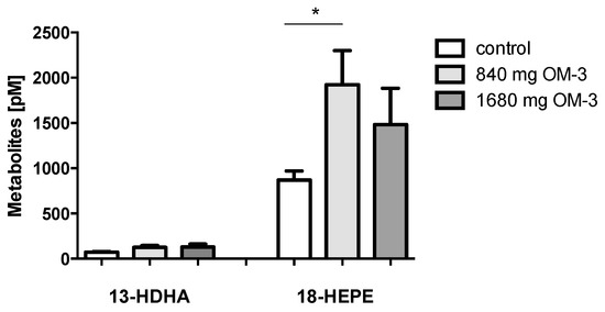 Effect of EPA/DHA supplementation on 18-hydroxyeicosapentaenoic acid (18-HEPE) and 13-hydroxydocohexaenoic acid (13-HDHA). 18-HEPE and 13-HDHA were measured in plasma of hyperlipidemic patients with different doses of n-3 PUFA as indicated. All results are shown as the mean ± SEM. Differences between the groups are significant as indicated (* p < 0.05).