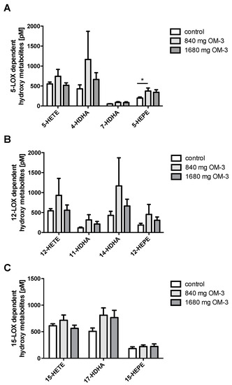 Effect of n-3 PUFA supplementation on 5-, 12-, and 15- lipoxygenase (LOX)-dependent AA-, DHA-, and EPA-derived hydroxy metabolites measured in plasma. (A) Changes in 5-LOX-dependent hydroxy metabolites; (B) Changes in 12-LOX-dependent hydroxy metabolites; (C) Changes in 15-LOX-dependent hydroxy metabolites. All results are shown as the mean ± SEM. Differences between the groups are significant as indicated (* p < 0.05).