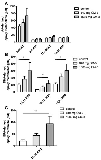 Comparison of AA-, DHA-, and EPA-derived epoxy metabolites. (A) Epoxyeicosatrienoic acids (EETs), AA-derived epoxy metabolites, were measured in plasma of hyperlipidemic patients receiving different doses of dietary n-3 PUFAs; (B,C) Accordingly, epoxydocosapentaenoic acids (EDPs) and 14,15-epoxyeicosatetraenoic acid (14,15-EEQ), which are DHA- and EPA-derived epoxy metabolites, were quantified in plasma. All results are shown as the mean ± SEM. Differences between the groups are significant as indicated (* p < 0.05; ** p < 0.01).