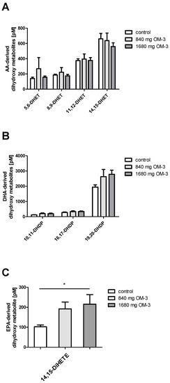 Profile of AA-, DHA- and EPA-derived dihydroxy metabolites. The dihydroxy metabolites are generated by the action of soluble epoxide hydrolase (sEH) from their parent epoxide metabolites. (A) Mean plasma levels of dihydroxyeicosatrienoic acids (DHETs), AA-derived dihydroxy metabolites are shown; (B) Mean plasma levels of dihydroxydocosapentaenoic acids (DHDPs), DHA-derived dihydroxy metabolites, are illustrated; (C) Mean plasma level of 14,15-DiHETE, an EPA-derived hydroxy metabolite, in correlation with different doses of n-3 PUFA is shown. All results are shown as the mean ± SEM. Differences between the groups are significant as indicated (* p < 0.05).