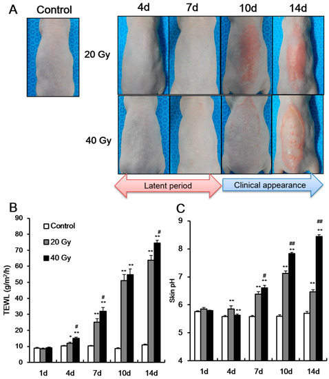 Increase of transepidermal water loss and skin pH in the latent stage of irradiated skin. (A) Phenotype and the levels of (B) transepidermal water loss (TEWL), and (C) skin surface pH of 0 (control), 20, and 40 Gy irradiated skin of SKH1 mice for 14 days (shown as “d” in figure body). Data are presented as the mean ± standard error of the mean. n = 5 mice for each group. * p < 0.05 and ** p < 0.01 compared with the control group; # p < 0.05 and ## p < 0.01 compared with the 20 Gy group.