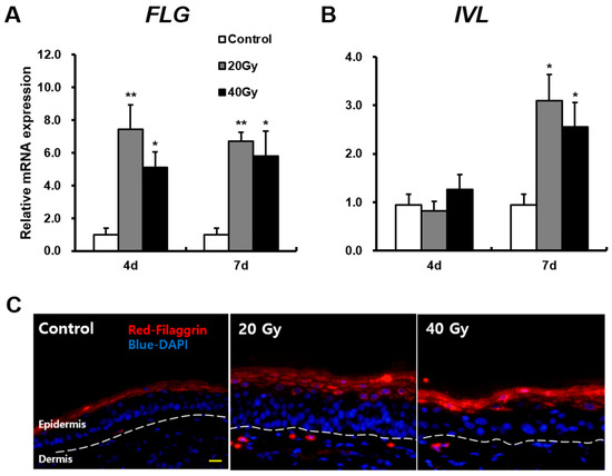 Increased fundamental proteins of the skin barrier in the latent stage on irradiated skin. mRNA levels of (A) filaggrin (FLG), (B) involucrin (IVL) in the skin of 0 (Control), 20, and 40 Gy irradiated mice at 4 and 7 days. (C) Immunofluorescence stain of FLG in the irradiated skin of 20 and 40 Gy groups at 7 days. Scale bar = 20 μm. Data are presented as the mean ± standard error of the mean. n = 5 mice for each group. * p < 0.05 and ** p < 0.01 compared with the control group.