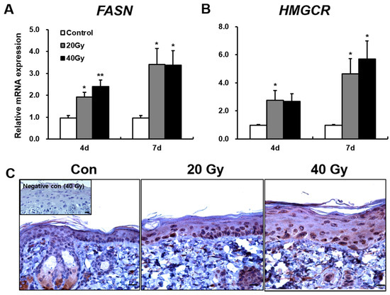 Increased keratinocyte-derived lipids synthesis enzymes in the latent stage of the irradiated skin. mRNA levels of (A) Fatty acid synthase (FASN) and (B) 3-hydroxy-3-methylglutaryl-CoA reductase (HMGCR) in the irradiated skin of 0 (Control), 20, and 40 Gy groups at 4 and 7 days after exposure; (C) Immunohistochemistry of FASN in the skin of 0 (Control; Con), 20, and 40 Gy irradiated mice at 7 days. Insert: negative control. Scale bar = 20 μm. Data are presented as the mean ± standard error of the mean. n = 5 mice for each group. * p < 0.05 and ** p < 0.01 compared with the control group.