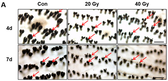 To detect dermatological phenotype alteration due to irradiation in a mouse model, we evaluated the skin of SKH1 mice that received a single dose of 20 or 40 Gy local irradiation for 14 days. The skin of 20 and 40 Gy groups showed no signs until 7 days after irradiation (Figure 1A). At 10 days, clinical symptoms appeared in both groups (Figure 1A). Thus, the latent stage in 20 and 40 Gy irradiated mouse model was 7 days.