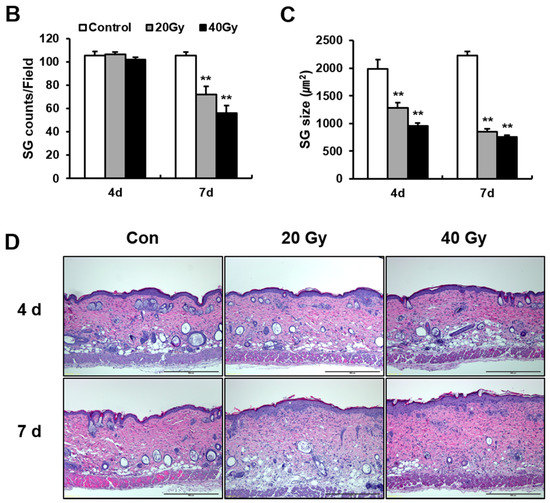 Decrease of sebaceous gland size and number by irradiation in the latent stage. (A) Optical microscopy view of sebaceous glands (SGs) in the epidermal sheet of 0 (Control; Con), 20, and 40 Gy irradiated skin at 4 and 7 days. Scale bar = 200 μm. Analysis of (B) the number of SGs and (C) the size of SGs in the irradiated skin of 0 (Control), 20, and 40 Gy groups at 4 and 7 days. (D) H&E stain of the 0 (Control; Con), 20, and 40 Gy irradiated skin at 4 and 7 days. Scale bar = 500 μm. Data are presented as the mean ± standard error of the mean. n = 5 mice for each group. ** p < 0.01 compared with the control.