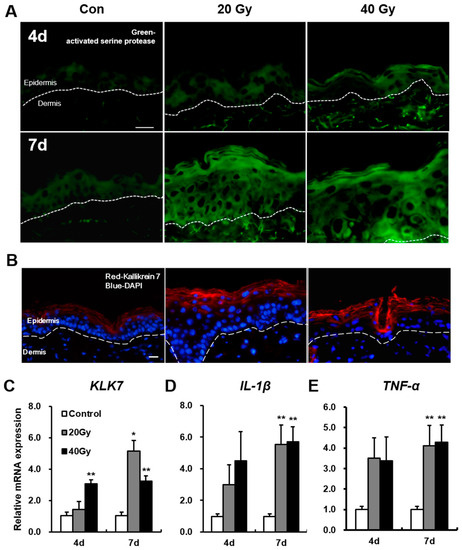 Upregulation of serine protease (KLK7) activity and expression in the latent stage of the irradiated skin. (A) Assay of serine protease activity by in situ zymography in the skin of 0 (control; Con), 20, and 40 Gy irradiation at 4 and 7 days. Scale bar = 20 μm; (B) Immunofluorescence stain of KLK 7 in the irradiated skin of 0 (control; Con), 20, and 40 Gy at 7 days. Bar = 20 μm. mRNA levels of (C) KLK7; (D) IL-1β, and (E) TNF-α in the irradiated skin of 0 (control), 20, and 40 Gy at 4 and 7 days. Data are presented as the mean ± standard error of the mean. n = 5 mice for each group. * p < 0.05 and ** p < 0.01 compared with the control group.